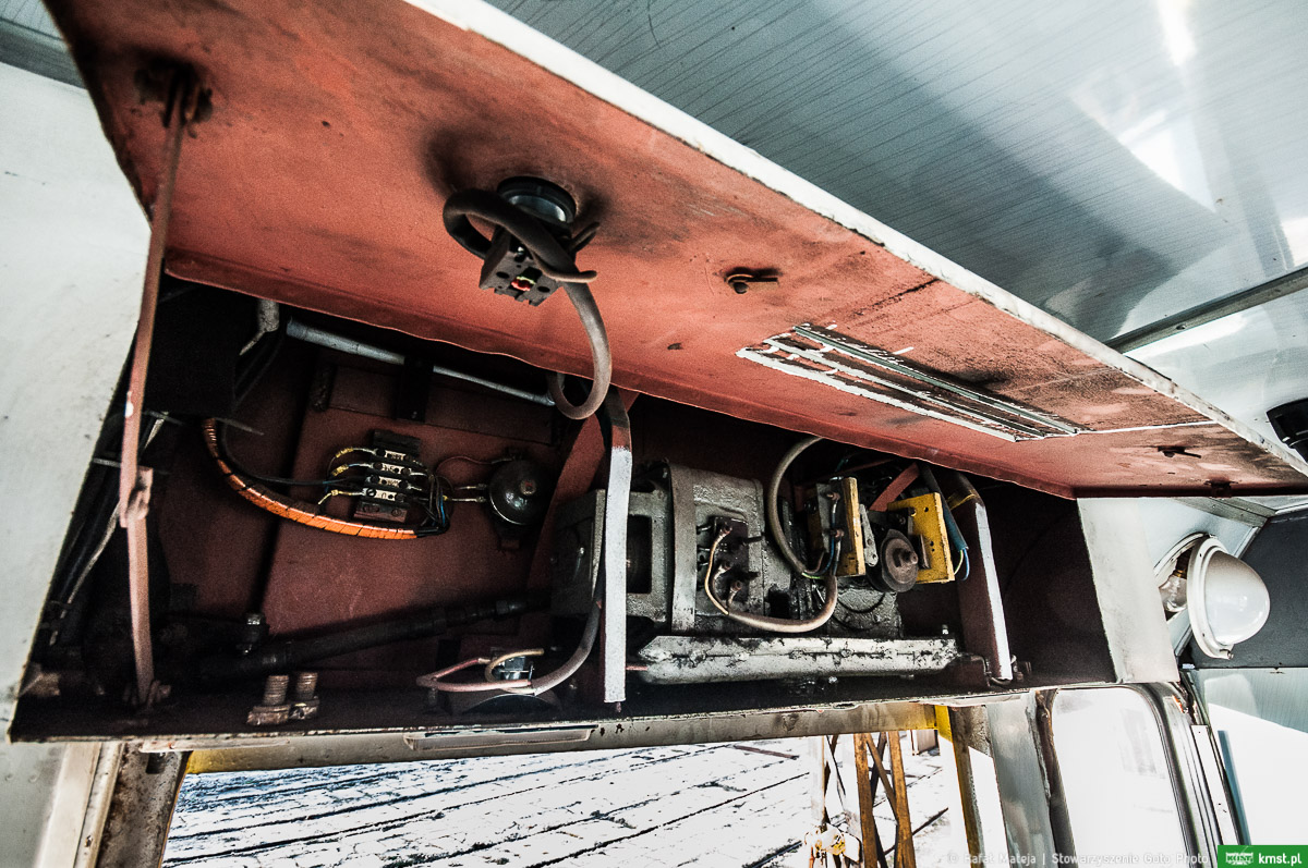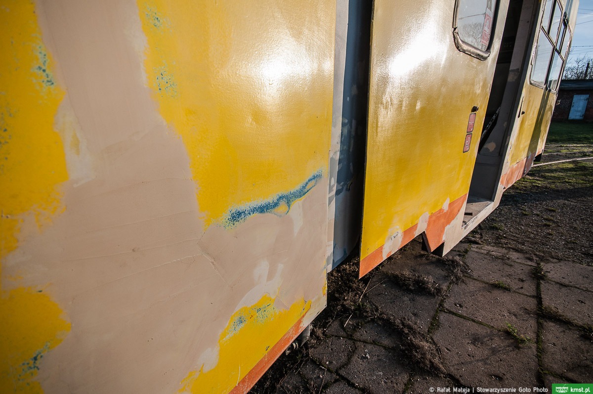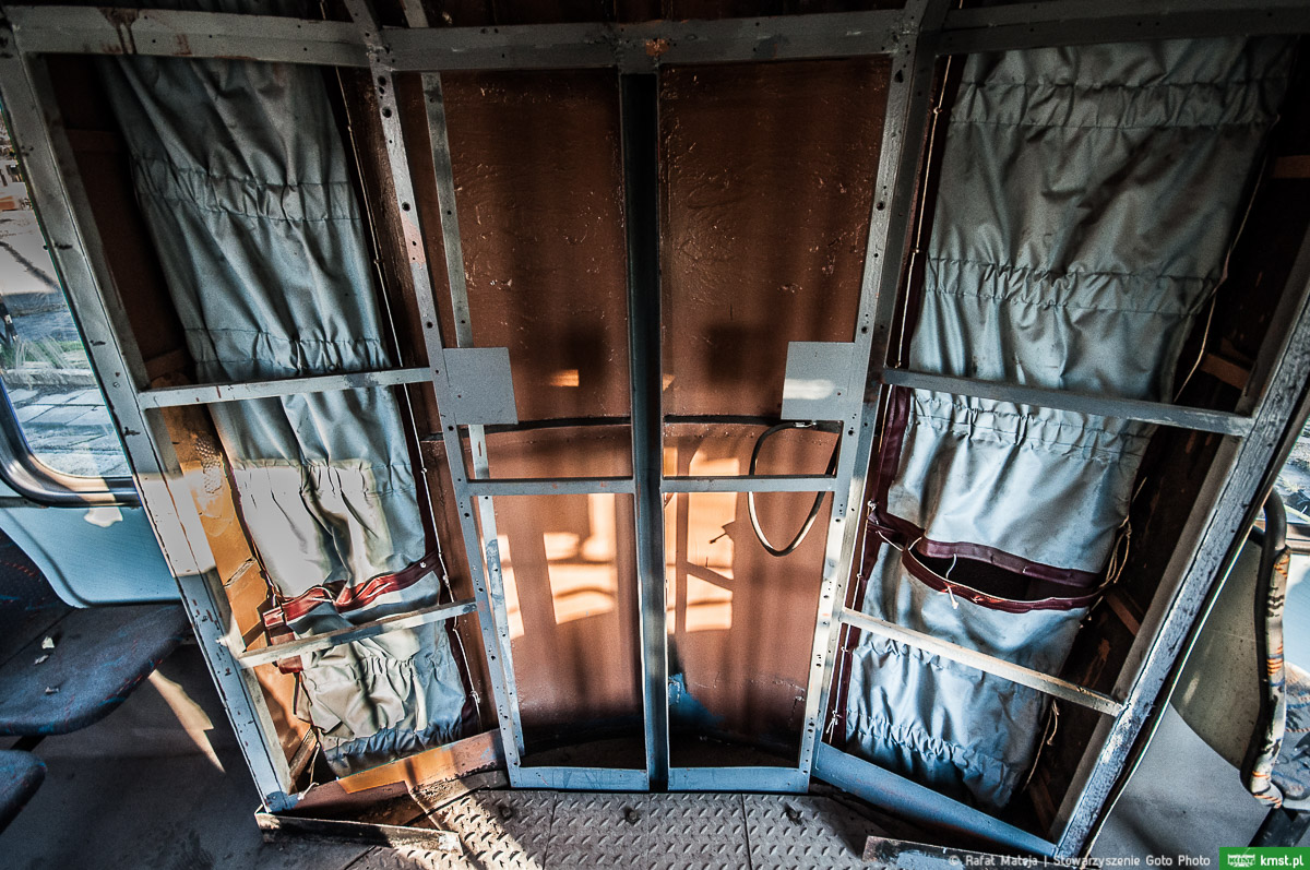 Obecnie prace skupiają się na naprawie drzwi. Poszczególne skrzydła zostały wyjęte, a skorodowane elementy wycięto. Naprawy dotyczą również poszycia zewnętrznego, gdzie wstawiono nowe fragmenty blachy. Trwa szpachlowanie ubytków. Do przeprowadzenia pozostają jeszcze drobne prace wewnątrz pojazdu.